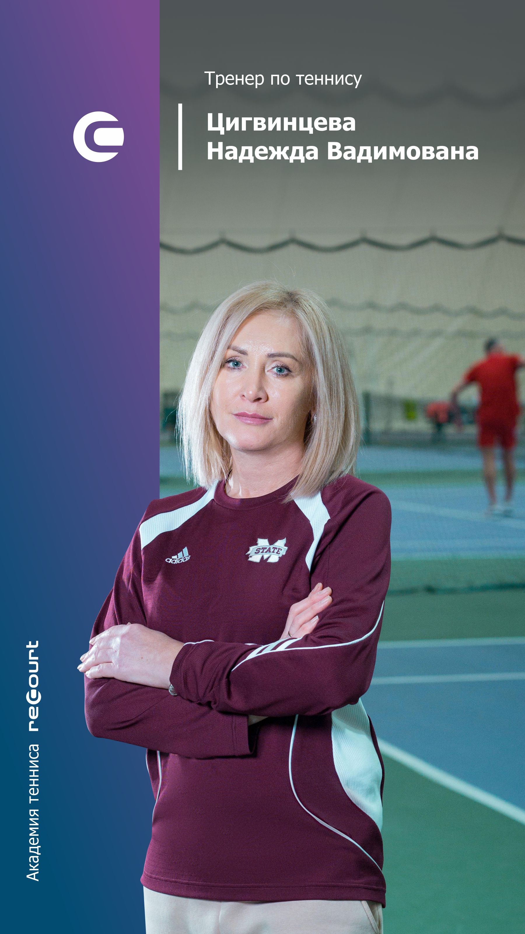Образование: Высшее, Удмуртский государственный университет Звание/разряд: КМС Личные достижения в спорте: Неоднократная чемпионка российских турниров среди ветеранов и первенств Удмуртии Стаж работы: 20 лет Специфика работы: Работа с детьми от 5 лет Работа с с любителями разного уровня подготовки и возраста Курсы повышения квалификации: Научно-методологические конференции по теннису Девиз: Играй в тенис. Совершенствуйся, побеждай!